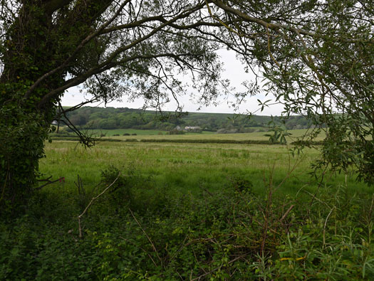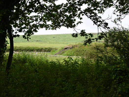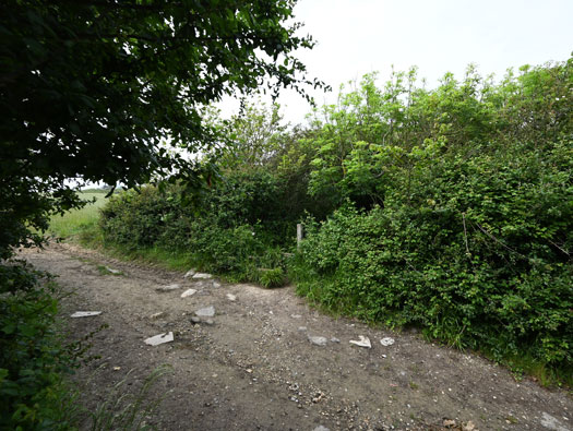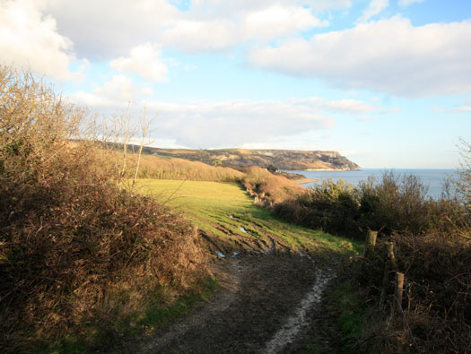 We have just been walking through the far wood and down to the sea, now walking west along the coast path, there is a style on the right and you cross this track between two fields. And then enter the next wood that runs north.