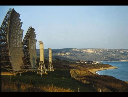 The way Chain Home worked was very like turning a flood light on and pointing it outwards away from where you wish to defend. This (flood light) was four steel framed aerials. Laid out in a straight line pointing towards your enemy. When an aircraft flew into the (flood light), the reflection is bounced off the plane and returned to (east coast four, west coast two, aerials) here two large wooden aerials.