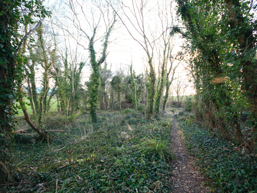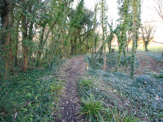 Walking west along the coast path and there is a style on the right side and a path crossing this track leading into the next wood.