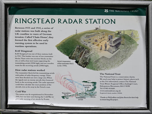 RAF Ringstead was part of the Chain Home (CH) and Chain Home Low (CHL) transmitter/receiver radar. Started in 1940 but too late for the Battle of Britain. It continued service until 1956 by then using the new 'Rotor Radar'. In 1963 part of the site was taken over by the USAF as 2180 Com. Sqn. operating a Tropospheric Scatter System link. This closed down in 1974 and the aerials were removed shortly after.