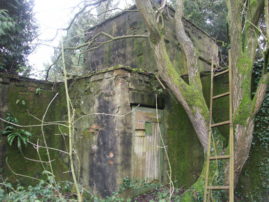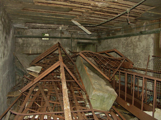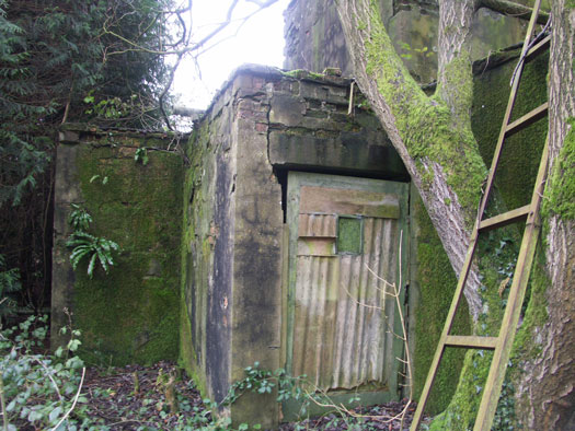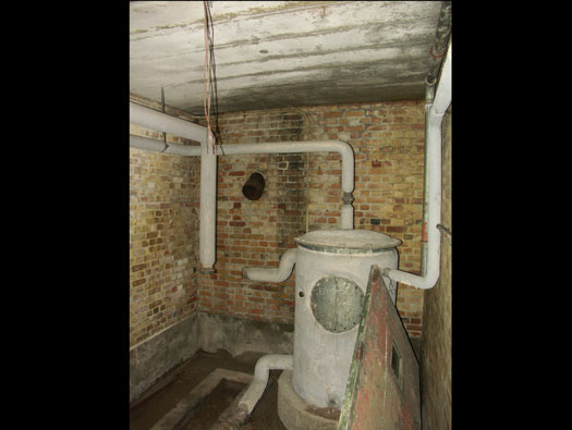 This is the airlock exit for finished cases. Note the door is quite a heavy wooden type and it would have had a rubber seal around it to keep up the higher air pressure inside. This is to stop the ingress of any gas that may be around. The ladder looks to be an original tat would have allowed access to the flat roof and the large water tank. A lot of water would be used, so a large tank was needed.
