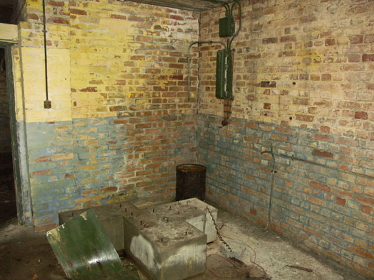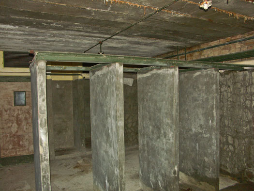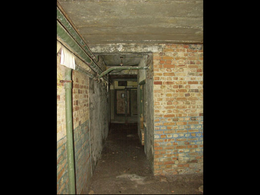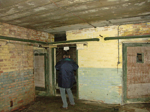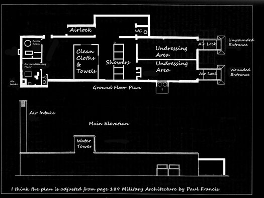 'KM' designates that it was a 13.5inch solid brick walls with a Siegwart pre-cast hollow concrete beam slab roof (PF). You would walk in through the wounded or unwounded entrance on the right and undress. All cloths would be passed through a letter type box to bins outside, to be disposed of later. If wounded, you would be treated and then pass through a shower and be scrubbed with hard wooden broom like brushes to wash out the contamination. A bleach agent could also be used as a treatment. Then you would dry off and get dressed with clean cloths and exit via the top air lock. Hopefully in one piece.