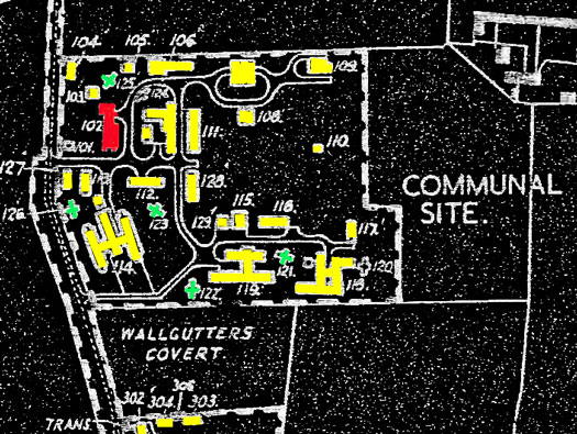 Situated by the entrance of the Communal site where everybody on the station would pass it everyday and know exactly where it was in an emergency. The two entrances were directly onto the road.