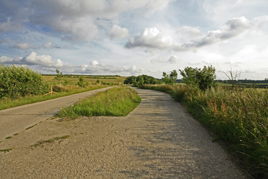 Bomb Storage Area. We have now moved from the north side to the south side. This is the road coming up from the valley on the south side through the three fuzing points. 134-135 two high explosive fuzing point buildings extra heavy Nissen 6177/43.