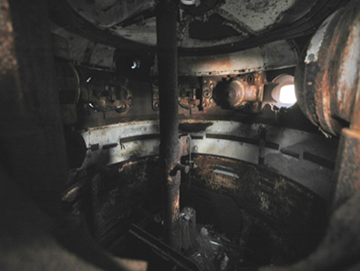 The turret inside with he periscope tub in place and the embrasure plugs to close off the aperture hinged open. This looks to be a 40P8 cupola.