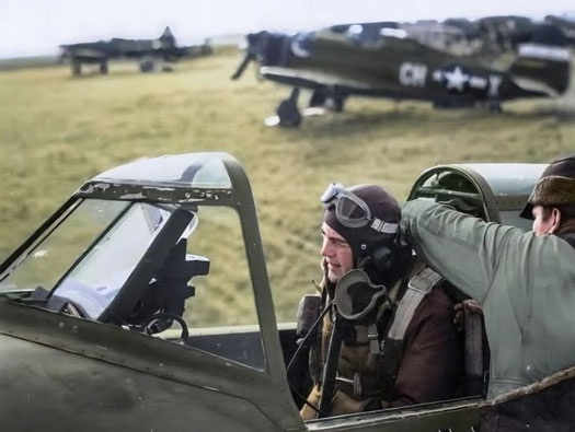 Colonel Hubert "Hub" Zemke, commanding officer of the 56th Fighter Group, was photographed in the cockpit of his P-47 Thunderbolt at RAF Manston May 1944 who commanded them here.