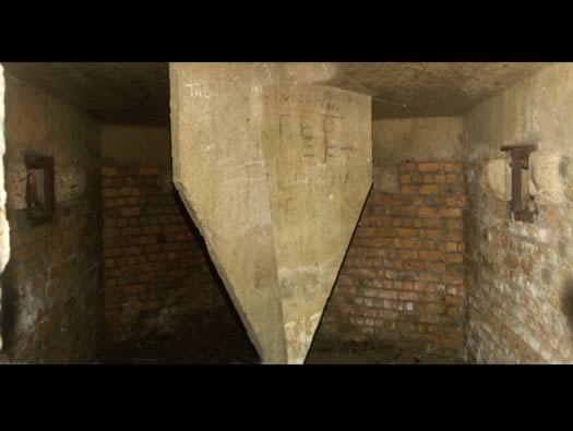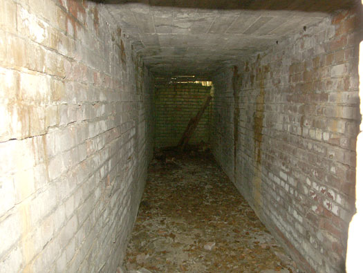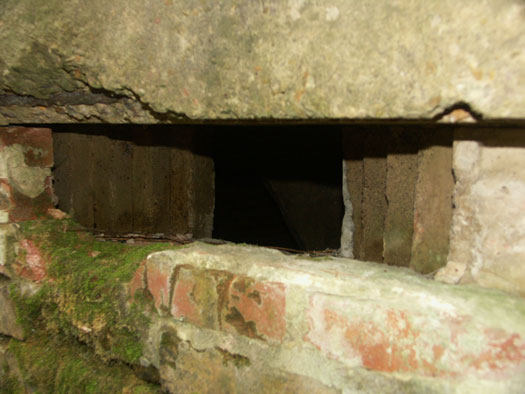 A protected rear entrance, earth would have been heaped up against the concrete panels to make a sort of trench. The entrance is now blocked off.