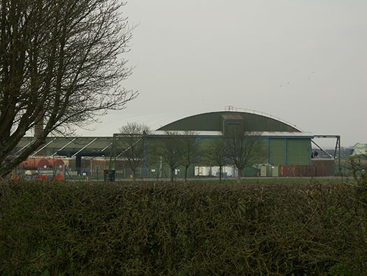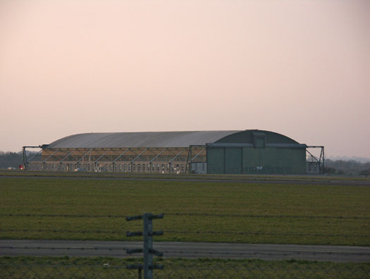 'K' type hangar with a section in the door to allow larger aircraft to get inside. In the centre of the airfield.
