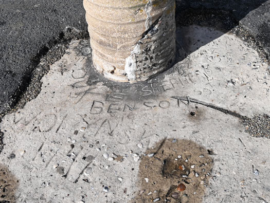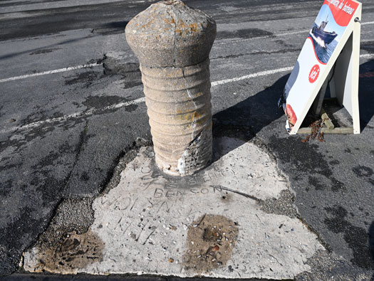 A concrete bollard to tie up fishing boats. Possibly the original was damaged and the American Engineers helping to clear the port added their names in the concrete.