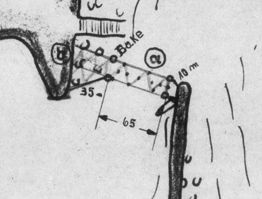 The gate was at one time double the width and when the Germans started to defend the area, this wall was built to to make the entrance smaller. The small picture seems to show the gate fully closed off with a new wall.