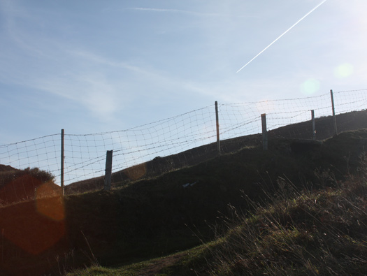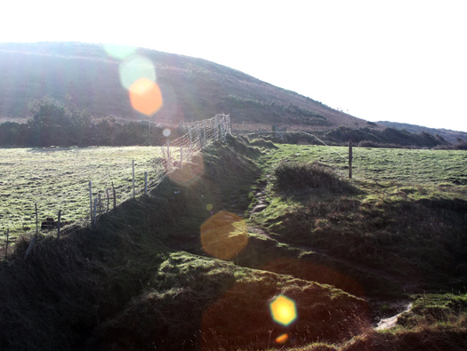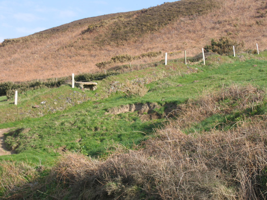 A plan of today showing the trench line and there must have been more that these. The hedges and ditches would all have been integrated into a defence system. The 5cm KwK may have been placed looking out to sea, below the small hut.