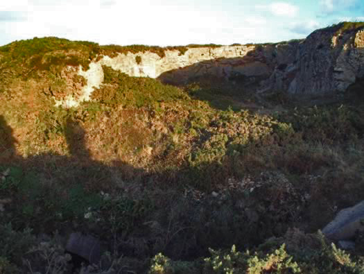 The stairs come out into an old quarry on the left and the cliff edge on the right.