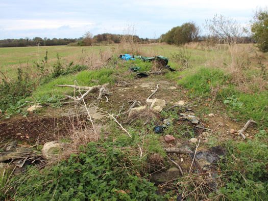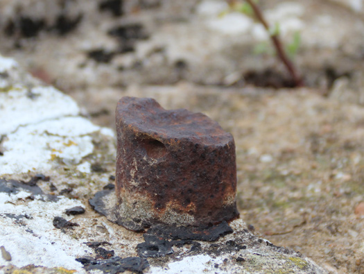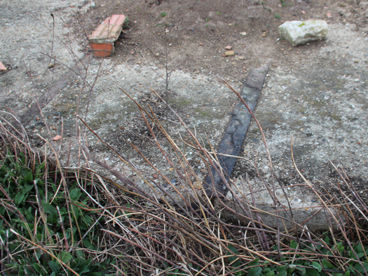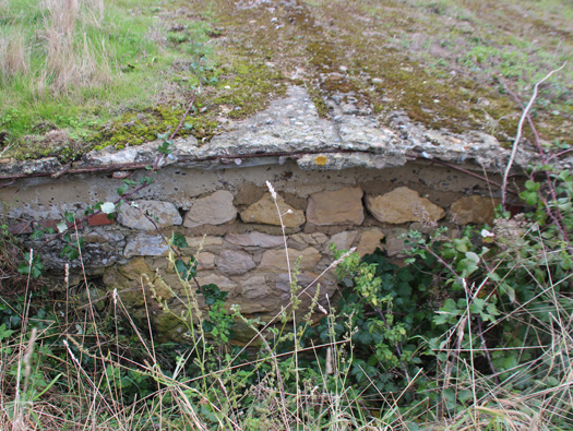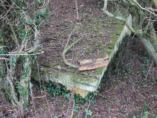 A picture showing how the concrete was sealed with a tar paint. Pieces of the steel mesh reinforcement left proud, to allow a camouflage net to be hooked on.