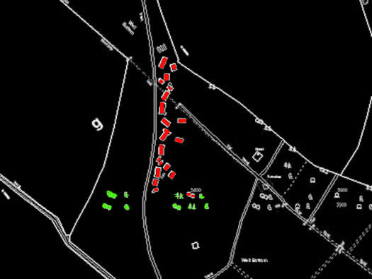 OS Ref: SY592904 The huts are laid out on the eastern side of the track leading up from the A35 and all hidden in woodland.