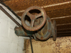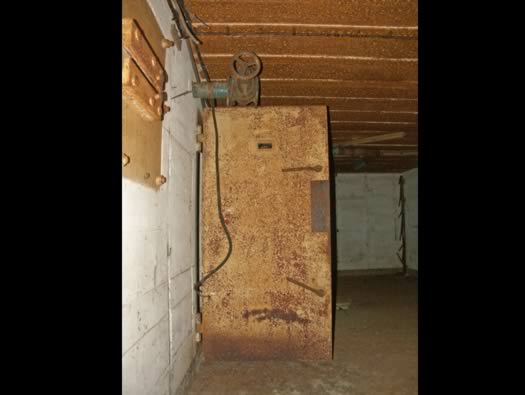 A 19p7 door with its small glass viewing window and two swing arm door handles.