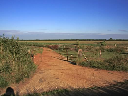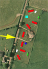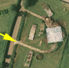 INFORMATION: Concrete track running around in a U. 7 - hut bases red. 1 - picket post blue. 1 - EWS emergency water supply blue. 2 - toilet blocks white. 1 - fuel store in the centre (?) . Above : fuel store.