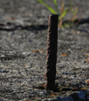 Above : a bolt set into the concrete foundations to hold the wooden hut down.
