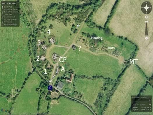 Plan: P - Parking. GP - Guard Post. A - Ammunition Magazine. CP - Command Post plotting room. 1-2-3-4 - Gun emplacements. MT - Motor Transport.