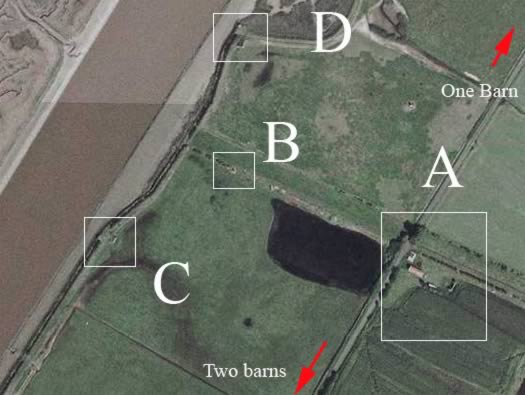The two barns are just south of this plan, then the road continues towards a large earth bank or dyke running from LtoR and the road drives over it. Park here.