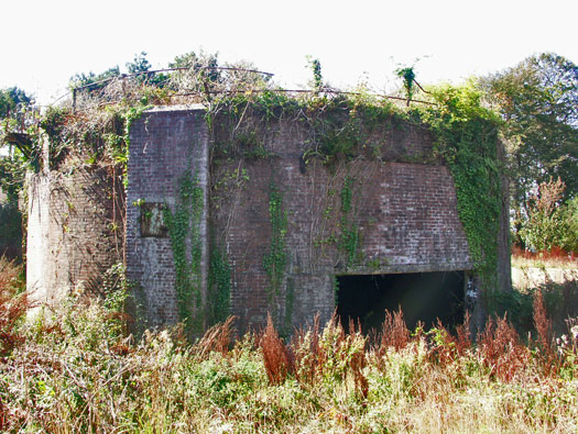 The second protected fuel tank with a brick built wall around it. Plan, Tank top right. Dumped pipes and valves,