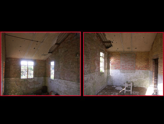 The main room. It still has all the electrics (rubber covered red and black wire). To the right is the door to a toilet. On the floor is a pre cast concrete wash stand.