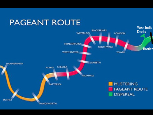 The official route, the boat was mustered at the West India Dock the day before, scrutinised to make sure it was safe and the at 8.00am we entered the lock to the Thames. 10am we were at the houses of Parliament to hear Big Ben strike 10. Then continuing on to Kew railway bridge and our muster station. 2.00pm the procession left and we progressed down the Thames, passed the Queen to the Thames Barrier, turned and entered the lock and then into West India Dock. Arriving at friends in Stanmore in time to see the 10pm news.