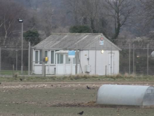 QuintiQ's site entrance with a picket post that looks like a prefab design. There may not have been buildings here (except hangars) in wartime but this area was also used by a Maintenance Unit sorting out wartime munitions and the buildings could be a result of the MU.
