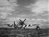 Spitfire with a long range drop tank ready to take off with its starting trolley under the wing.
