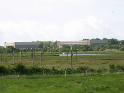 Two of the six now only four C hangars. Foreground are the landing lights for the main runway, north end.