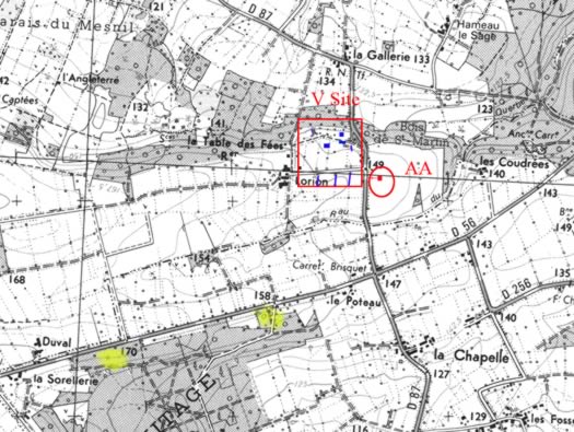 The D56 running E/W and the D87 N/S. The V1 site is situated in the square and the search light circled in red.